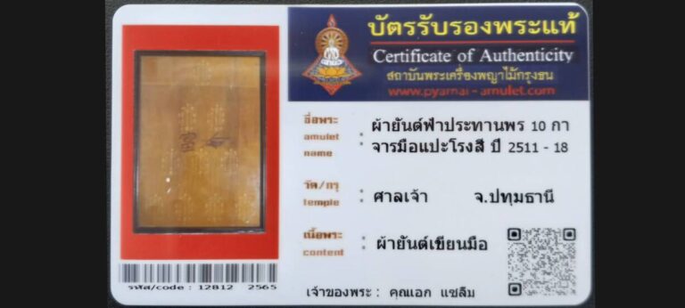 ไม่มีหมวดหมู่ ผ้ายันต์ฟ้าประทานพร 10 กา จารมือ อาแปะโรงสี วัดศาลเจ้า จ.ปทุมธานี เจ้าของพระ คุณเอก แซ่ลิ้ม รหัสบัตร 12812 – 2565