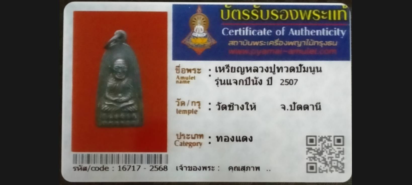ไม่มีหมวดหมู่ เหรียญหลวงปู่ทวดปั๊มนูน รุ่นแจกปีนัง วัดช้างให้ จ.ปัตตานี 05/12/2025 Pyamai Amulet เจ้าของพระ คุณสุภาพ รหัสบัตร 16717 – 2568
