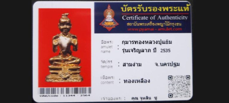 บัตรที่ผ่านการรับรองไม่มีหมวดหมู่ กุมารทองหลวงปู่แย้ม รุ่นเจริญลาภ วัดสามง่าม จ.นครปฐม เจ้าของพระ คุณจูหลิน ซู รหัสบัตร 11344 – 2564