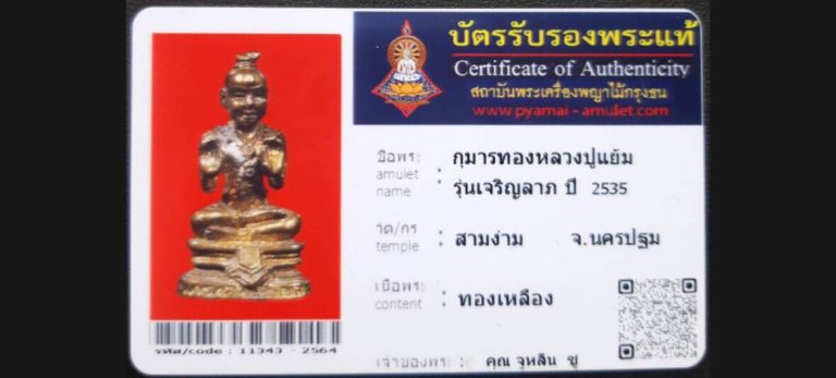 บัตรที่ผ่านการรับรองไม่มีหมวดหมู่ กุมารทองหลวงปู่แย้ม รุ่นเจริญลาภ วัดสามง่าม จ.นครปฐม เจ้าของพระ คุณจูหลิน ซู รหัสบัตร 11343 – 2564