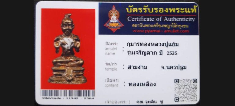 บัตรที่ผ่านการรับรองไม่มีหมวดหมู่ กุมารทองหลวงปู่แย้ม รุ่นเจริญลาภ วัดสามง่าม จ.นครปฐม เจ้าของพระ คุณจูหลิน ซู รหัสบัตร 11342 – 2564
