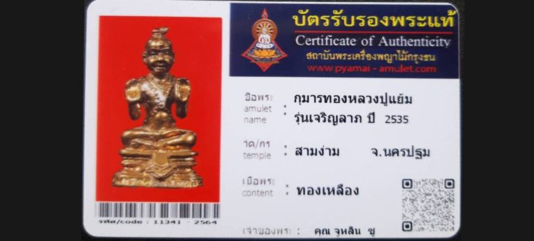 บัตรที่ผ่านการรับรองไม่มีหมวดหมู่ กุมารทองหลวงปู่แย้ม รุ่นเจริญลาภ วัดสามง่าม จ.นครปฐม เจ้าของพระ คุณจูหลิน ซู รหัสบัตร 11341 – 2564