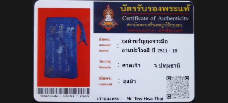 บัตรที่ผ่านการรับรอง (ซ่อน) ขวัญถุงผ้าจารมือยันต์ฟ้าประทานพร อาแปะโรงสี วัดศาลเจ้า จ.ปทุมธานี เจ้าของพระ Mr.Tew Hwa Thai รหัสบัตร 12351 – 2565