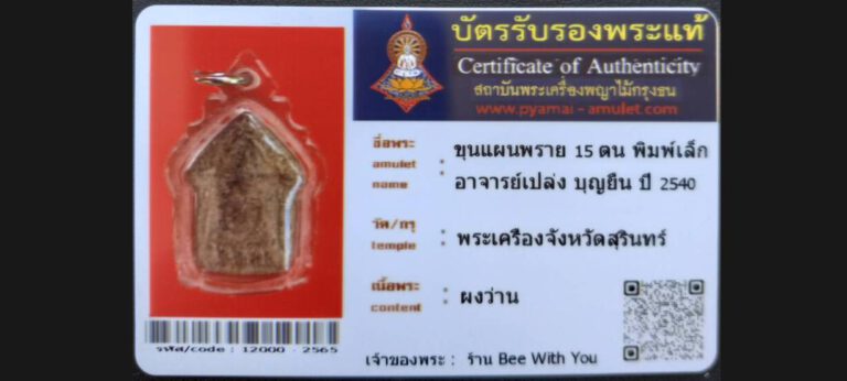 บัตรที่ผ่านการรับรองไม่มีหมวดหมู่ ขุนแผนพราย 15 ตน พิมพ์เล็ก อาจารย์เปล่ง บุญยืน พระเครื่องจังหวัดสุรินทร์ เจ้าของพระ ร้าน Bee With You รหัสบัตร 120000 – 2565