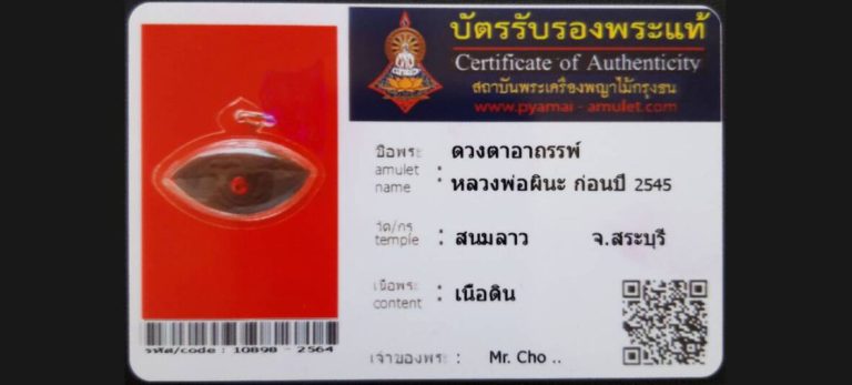 บัตรที่ผ่านการรับรองไม่มีหมวดหมู่ ดวงตาอาถรรพ์หลวงพ่อผินะ วัดสนมลาว จ.สระบุรี เจ้าของพระ Mr.Cho.. รหัสบัตร 10898 – 2564