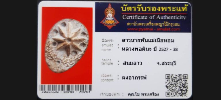 บัตรที่ผ่านการรับรองไม่มีหมวดหมู่ ดาวนายพันแม่เนื้อหอมหลวงพ่อผินะ วัดสนมลาว จ.สระบุรี เจ้าของพระ คุณโช พระเครื่อง รหัสบัตร 10703 – 70764