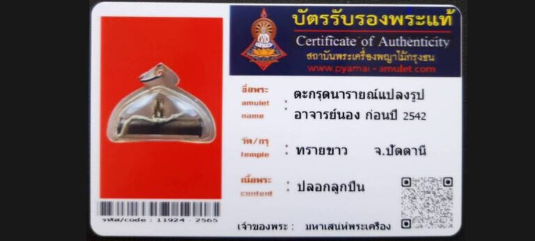บัตรที่ผ่านการรับรองไม่มีหมวดหมู่ ตะกรุดนารายณ์แปลงรูป อาจารย์นอง วัดทรายขาว จ.ปัตตานี เจ้าของพระ มหาเสน่ห์พระเครือง รหัสบัตร 11924 – 2565