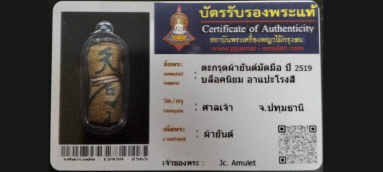ไม่มีหมวดหมู่ ตะกรุดผ้ายันต์มัดมือไหม บล๊อคนิยม อาแปะโรงสี วัดศาลเจ้า จ.ปทุมธานี เจ้าของพระ Jc. Amulet รหัสบัตร 12959 – 2565