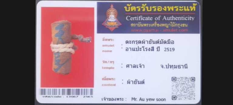 ไม่มีหมวดหมู่ ตะกรุดผ้ายันต์มัดมือ อาแปะโรงสี วัดศาลเจ้า จ.ปทุมธานี เจ้าของพระ Mr. Au yew soon รหัสบัตร 13067 – 2565