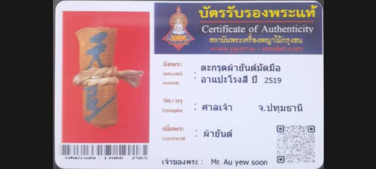 ไม่มีหมวดหมู่ ตะกรุดผ้ายันต์มัดมือ อาแปะโรงสี วัดศาลเจ้า จ.ปทุมธานี เจ้าของพระ Mr. Au yew soon รหัสบัตร 13066 – 2565