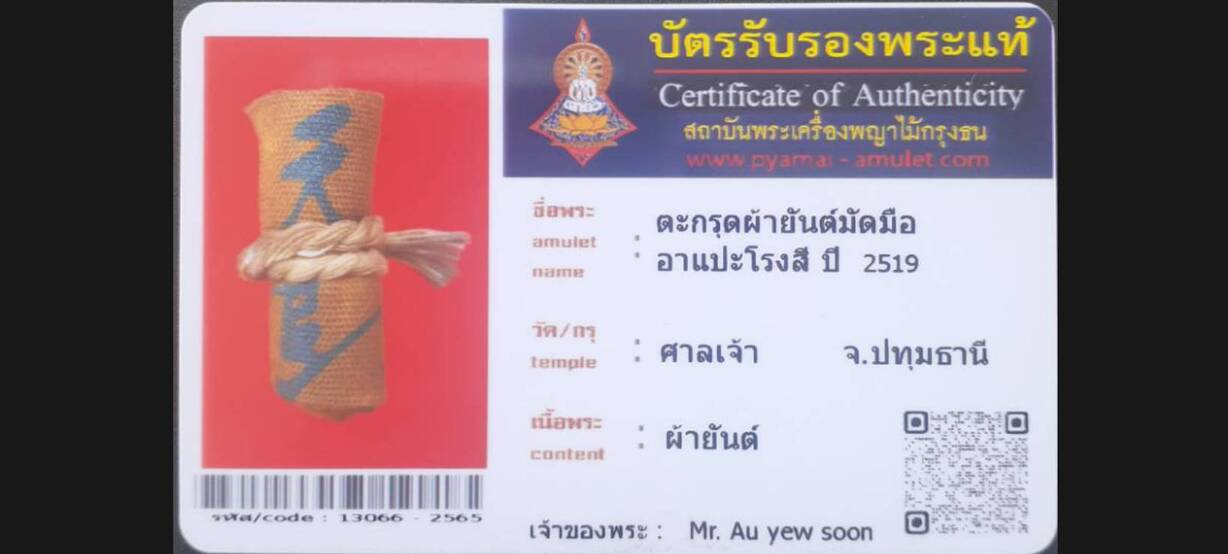 • Next → ตะกรุดผ้ายันต์มัดมือ อาแปะโรงสี วัดศาลเจ้า จ.ปทุมธานี