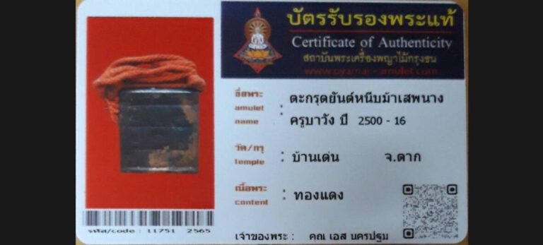 บัตรที่ผ่านการรับรองไม่มีหมวดหมู่ ตะกรุดยันต์หนีบม้าเสพนาง ครูบาวัง วัดบ้านเด่น จ.ตาก เจ้าของพระ เอส นครปฐม รหัสบัตร 11751 – 2565