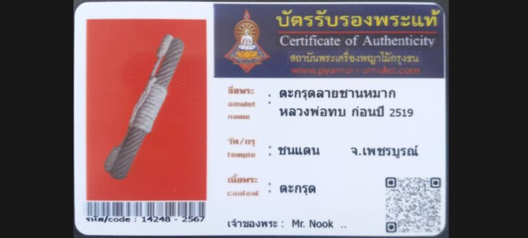 ไม่มีหมวดหมู่ ตะกรุดลายชานหมากหลวงพ่อทบ วัดชนแดน จ.เพชรบูรณ์ เจ้าของพระ Mr.Nook รหัสบัตร 14248 – 2566