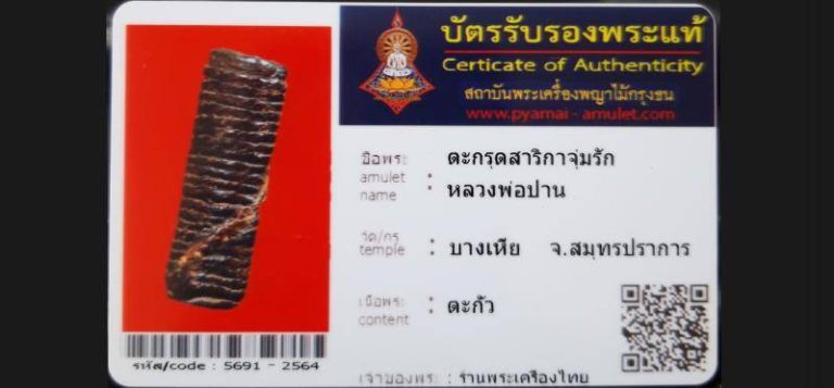 บัตรที่ผ่านการรับรองไม่มีหมวดหมู่ ตะกรุดสาริกาจุ่มรัก หลวงพ่อปาน วัดบางเหีย จ.สมุทปราการ เจ้าของพระ ร้านพระเครื่องไทย รหัสบัตร 5691-2564