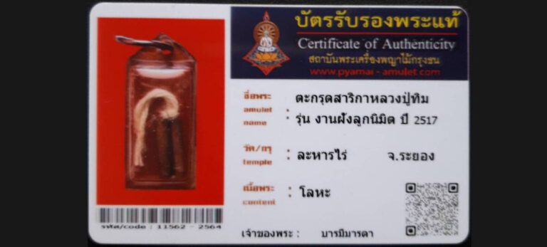บัตรที่ผ่านการรับรองไม่มีหมวดหมู่ ตะกรุดสาริกา หลวงปู่ทิม รุ่นฝังลูกนิมิตร วัดละหารไร่ จ.ระยอง เจ้าของพระ บารมีมารดา รหัสบัตร 11562 – 2564