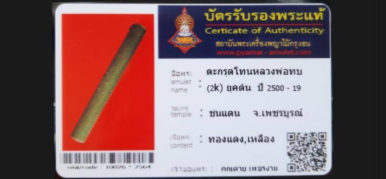 บัตรที่ผ่านการรับรองไม่มีหมวดหมู่ ตะกรุดโทน หลวงพ่อทบ วัดชนแดน จ.เพชรบูรณ์ เจ้าของพระ คุณต่าย เพชรงาม รหัสบัตร 10026 – 2564