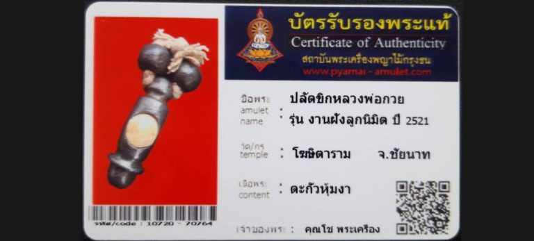 บัตรที่ผ่านการรับรองไม่มีหมวดหมู่ ปลัดขิกหลวงพ่อกวย รุ่นงานฝังลูกนิมิตร วัดโฆษิตาราม จ.ชัยนาท เจ้าของพระ คุณโช พระเครื่อง รหัสบัตร 10720 – 70764