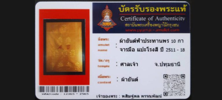 บัตรที่ผ่านการรับรอง (ซ่อน) ผ้ายันต์ฟ้าประทานพรจารมือ 10 กา อาแปะโรงสี วัดศาลเจ้า จ.ปทุมธานี เจ้าของพระ คุณพสิษฐ์พล พรรณพัฒน์ รหัสบัตร 12365 – 2565