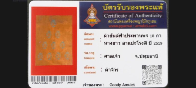บัตรที่ผ่านการรับรอง (ซ่อน) ผ้ายันต์ฟ้าประทานพรจารมือ 10 กา หางยาว อาแปะโรงสี วัดศาลเจ้า จ.ปทุมธานี เจ้าของพระ Goody Amulet รหัสบัตร 12587 – 2565
