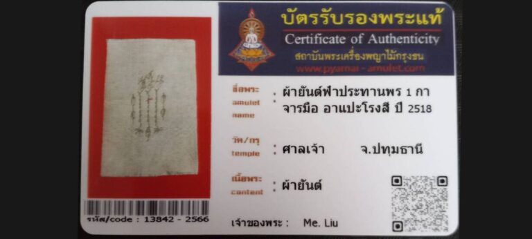 ไม่มีหมวดหมู่ ผ้ายันต์ฟ้าประทานพร 1 กาจารมือ อาแปะโรงสี วัดศาลเจ้า จ.ปทุมธานี เจ้าของบัตร Me.Liu รหัสบัตร 13842 – 2566