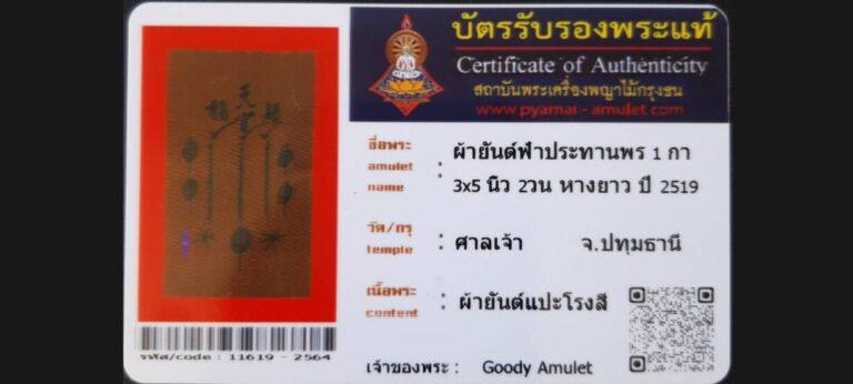 บัตรที่ผ่านการรับรอง (ซ่อน) ผ้ายันต์ฟ้าประทานพร 1 กา 3×5 นิ้ว 2 วน หางยาว อาแปะโรงสี วัดศาลเจ้า จ.ปทุมธานี เจ้าของพระ Goody Amulet รหัสบัตร 11619 – 2564