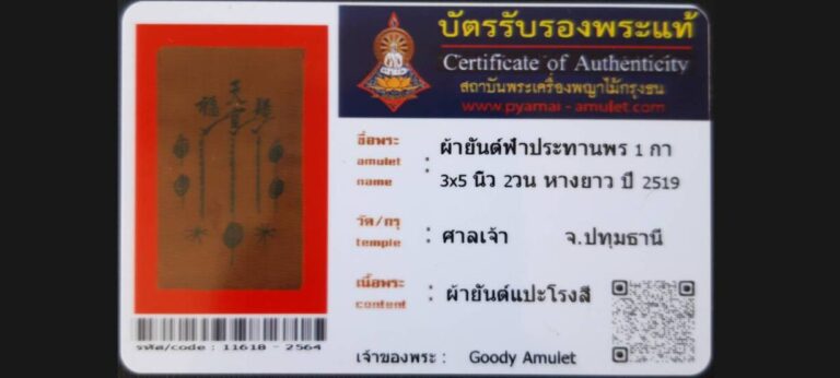 บัตรที่ผ่านการรับรอง (ซ่อน) ผ้ายันต์ฟ้าประทานพร 1 กา 3×5 นิ้ว 2 วน หางยาว อาแปะโรงสี วัดศาลเจ้า จ.ปทุมธานี เจ้าของพระ Goody Amulet รหัสบัตร 11618 – 2564