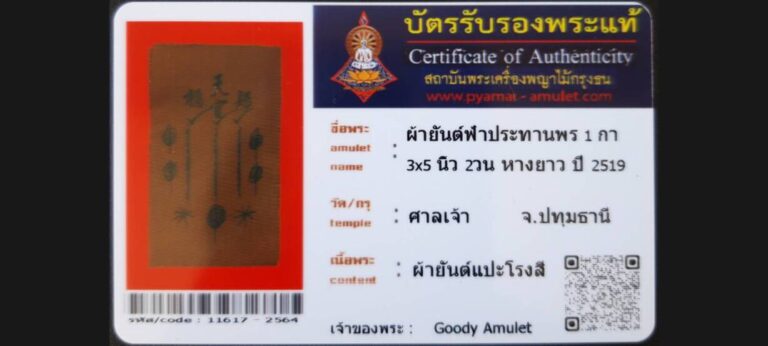 บัตรที่ผ่านการรับรอง (ซ่อน) ผ้ายันต์ฟ้าประทานพร 1 กา 3×5 นิ้ว 2 วน หางยาว อาแปะโรงสี วัดศาลเจ้า จ.ปทุมธานี เจ้าของพระ Goody Amulet รหัสบัตร 11617 – 2564