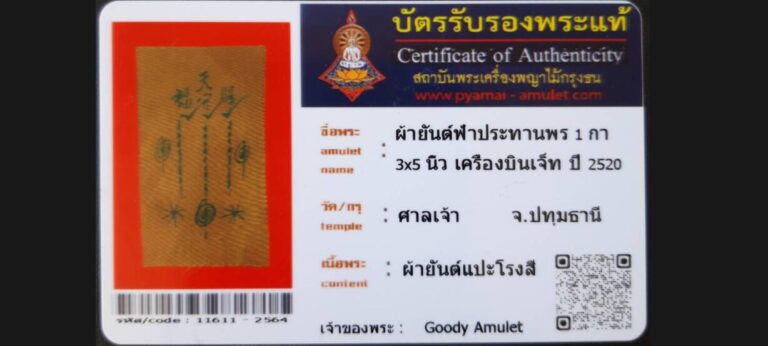 บัตรที่ผ่านการรับรอง (ซ่อน) ผ้ายันต์ฟ้าประทานพร 1 กา 3×5 นิ้ว เครื่องบินเจ็ท อาแปะโรงสี วัดศาลเจ้า จ.ปทุมธานี เจ้าของพระ Goody Amulet รหัสบัตร 11611 – 2565