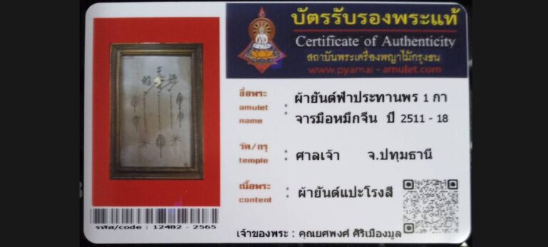 บัตรที่ผ่านการรับรอง (ซ่อน) ผ้ายันต์ฟ้าประทานพร 1 กาจารมือหมึกจีน วัดศาลเจ้า จ.ปทุมธานี เจ้าของพระ คุณยศพงศ์ ศิริเมืองมูล รหัสบัตร 12482 – 2565