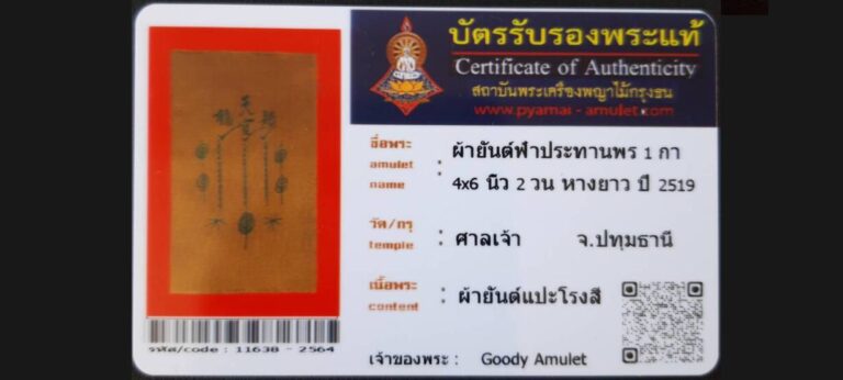 บัตรที่ผ่านการรับรอง (ซ่อน) ผ้ายันต์ฟ้าประทานพร 1 กา 4×6 นิ้ว 2 วน หางยาว อาแปะโรงสี วัดศาลเจ้า จ.ปทุมธานี เจ้าของพระ Goody Amulet รหัสบัตร 11638 – 2564