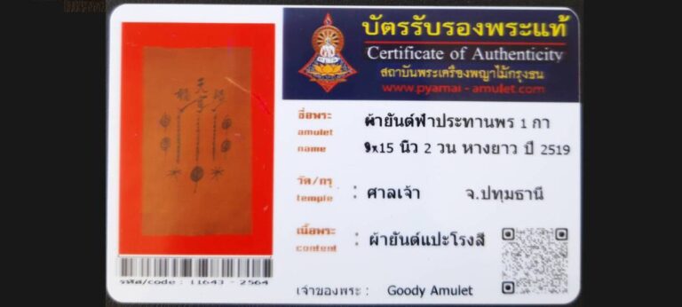 บัตรที่ผ่านการรับรอง (ซ่อน) ผ้ายันต์ฟ้าประทานพร 1 กา 9×15 นิ้ว 2 วน หางยาว อาแปะโรงสี วัดศาลเจ้า จ.ปทุมธานี เจ้าของพระ Goody Amulet รหัสบัตร 11643 – 2564