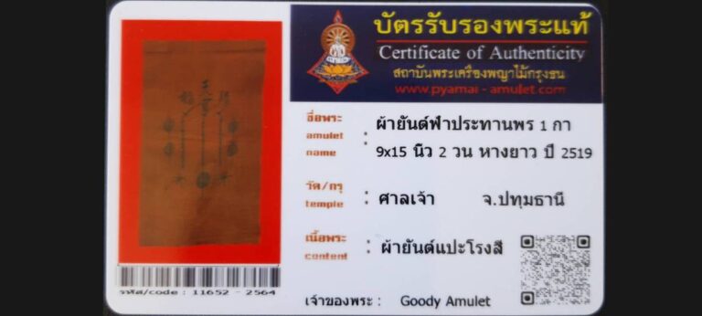 • ← Previous ผ้ายันต์ฟ้าประทานพร 1 กา 9×15 นิ้ว 2 วน หางยาว อาแปะโรงสี วัดศาลเจ้า จ.ปทุมธานี