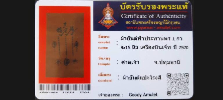 บัตรที่ผ่านการรับรอง (ซ่อน) ผ้ายันต์ฟ้าประทานพร 1 กา 9×15 นิ้ว เครื่องบินเจ็ท อาแปะโรงสี วัดศาลเจ้า จ.ปทุมธานี เจ้าของพระ Goody Amulet รหัสบัตร 11624 – 2565