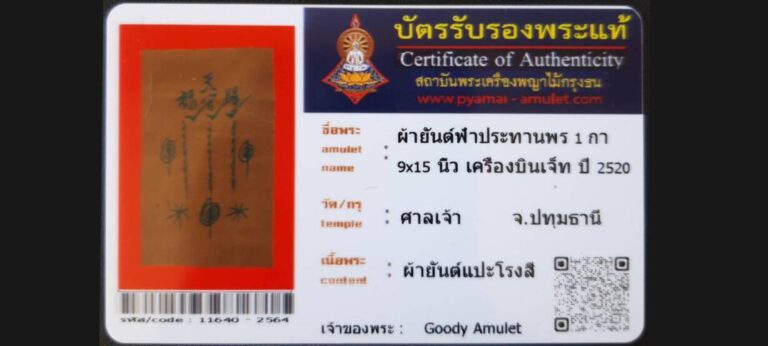 บัตรที่ผ่านการรับรอง (ซ่อน) ผ้ายันต์ฟ้าประทานพร 1 กา 9×15 นิ้ว เครื่องบินเจ็ท อาแปะโรงสี วัดศาลเจ้า จ.ปทุมธานี เจ้าของพระ Goody Amulet รหัสบัตร 11640 – 2565
