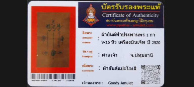 • Next → ผ้ายันต์ฟ้าประทานพร 1 กา 3×5 นิ้ว 2 วน หางยาว อาแปะโรงสี วัดศาลเจ้า จ.ปทุมธานี