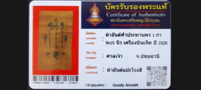 บัตรที่ผ่านการรับรอง (ซ่อน) ผ้ายันต์ฟ้าประทานพร 1 กา 9×15 นิ้ว เครื่องบินเจ็ท อาแปะโรงสี วัดศาลเจ้า จ.ปทุมธานี เจ้าของพระ Goody Amulet รหัสบัตร 11642 – 2565
