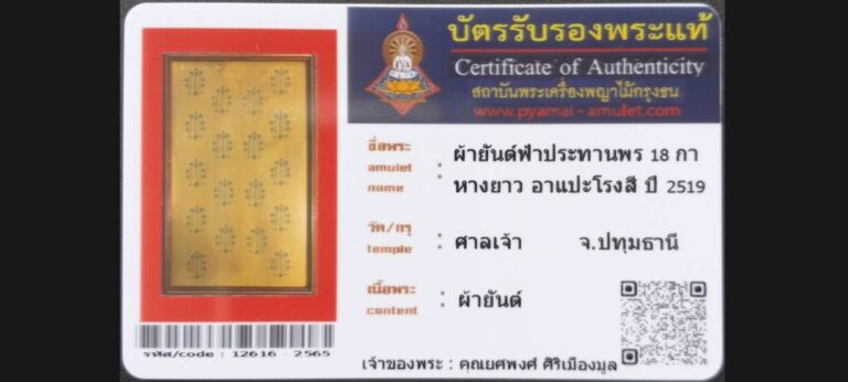 บัตรที่ผ่านการรับรอง (ซ่อน) ผ้ายันต์ฟ้าประทานพร 10กาหางยาว อาแปะโรงสี วัดศาลเจ้า จ.ปทุมธานี เจ้าของพระ คุณยศพงศ์ ศิริเมืองมูล รหัสบัตร 12616 – 2565