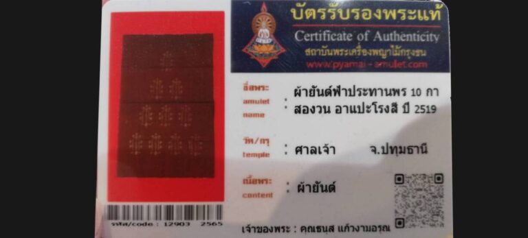 บัตรที่ผ่านการรับรอง (ซ่อน) ผ้ายันต์ฟ้าประทานพร 10 กาสองวน อาแปะโรงสี วัดศาลเจ้า จ.ปทุมธานี เจ้าของพระ คุณธนส แก้วงามอรุณ รหัสบัตร 12903 – 2566