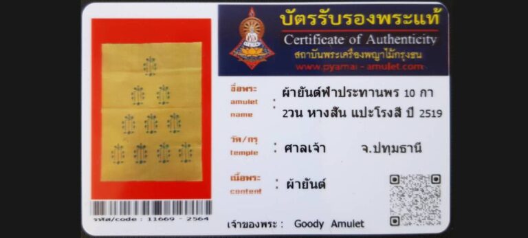 บัตรที่ผ่านการรับรอง (ซ่อน) ผ้ายันต์ฟ้าประทานพร 10 กา 2 วน หางสั้น อาแปะโรงสี วัดศาลเจ้า จ.ปทุมธานี เจ้าของพระ Goody Amulet รหัสบัตร 11669 – 2564