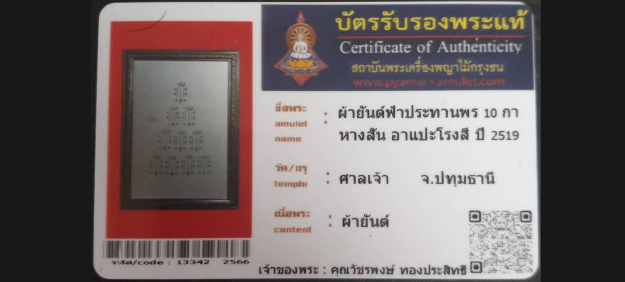 • ผ้ายันต์ฟ้าประทานพร 10 กาหางยาว อาแปะโรงสี วัดศาลเจ้า จ.ปทุมธานี