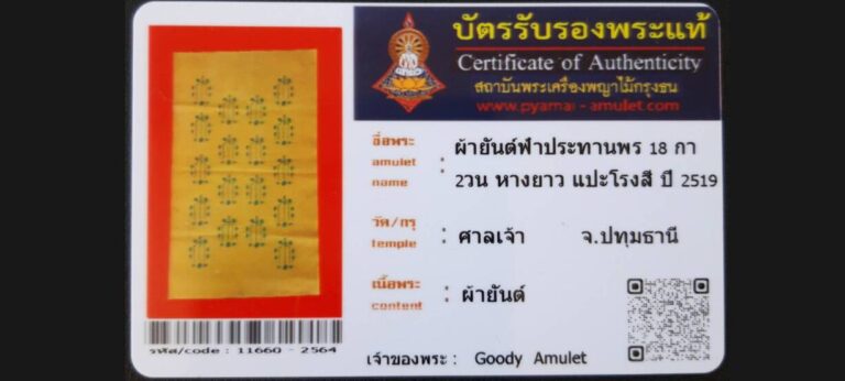 บัตรที่ผ่านการรับรอง (ซ่อน) ผ้ายันต์ฟ้าประทานพร 18 กา 2 วน หางยาว อาแปะโรงสี วัดศาลเจ้า จ.ปทุมธานี เจ้าของพระ Goody Amulet รหัสบัตร 11660 – 2564