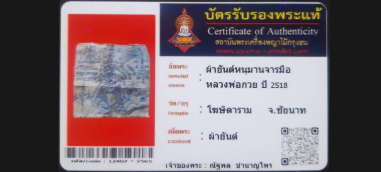 บัตรที่ผ่านการรับรอง ผ้ายันต์หนุมานจารมือ หลวงพ่อกวย วัดโฆษิตาราม จ.ชัยนาท เจ้าของพระ คุณณัฐพล ชำนาญไพร รหัสบัตร 12407 – 2565