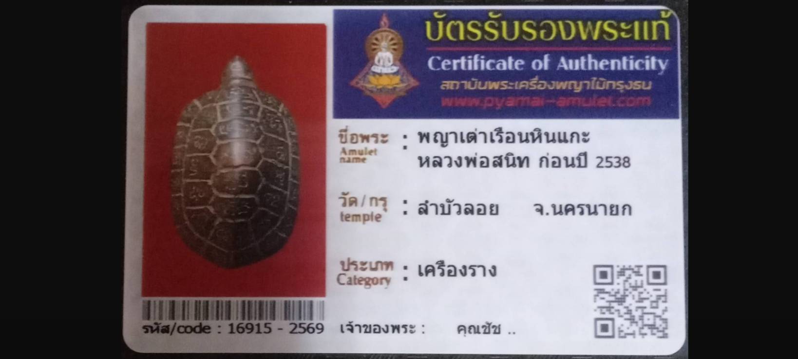 ไม่มีหมวดหมู่ พญาเต่าเรือนหินแกะ หลวงพ่อสนิท วัดลำบัวลอย จ.นครนายก เจ้าของพระ คุณชัช รหัสบัตร 16915 – 2569