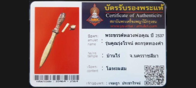 บัตรที่ผ่านการรับรองไม่มีหมวดหมู่ พระขรรค์หลวงพ่อคุณ ปี 2537 รุ่นคูณรุ่งโรจน์ ตะกรุดทองคำ วัดบ้านไร่ จ.นครราชสีมา เจ้าของพระ คุณเจษฎา ประชาโรจน์ รหัสบัตร 10464 – 2564
