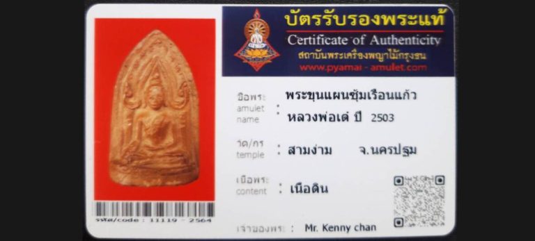 บัตรที่ผ่านการรับรองไม่มีหมวดหมู่ พระขุนแผนซุ้มเรือนแก้ว หลวงพ่อเต๋ วัดสามง่าม จ.นครปฐม เจ้าของพระ Mr.Kenny Chan รหัสบัตร 11119 – 2564