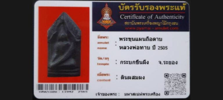 บัตรที่ผ่านการรับรองไม่มีหมวดหมู่ พระขุนแผนถือดาบ หลวงพ่อทาบ วัดกระบกขึ้นผึ้ง จ.ระยอง เจ้าของพระ มหาเสน่ห์พระเครือง รหัสบัตร 11942 – 2565