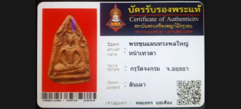 บัตรที่ผ่านการรับรองไม่มีหมวดหมู่ พระขุนแผนทรงพลใหญ่หน้าเทวดา กรุวัดจงกรม จ.อยุธยา เจ้าของพระ คุณเภกร นุชเฟื่อง รหัสบัตร 10752 – 2564