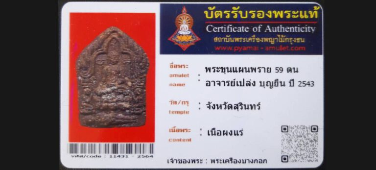 บัตรที่ผ่านการรับรองไม่มีหมวดหมู่ พระขุนแผนพราย 59 ตน อาจารย์เปล่ง บุญยืน จังหวัดสุรินทร์ เจ้าของพระ พระเครื่องบางกอก รหัสบัตร 11431 – 2564