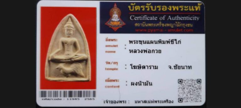 บัตรที่ผ่านการรับรองไม่มีหมวดหมู่ พระขุนแผนพิมพ์ขี่ไก่ หลวงพ่อกวย วัดโฆษิตาราม จ.ชัยนาท เจ้าของพระ มหาเสน่ห์พระเครือง รหัสบัตร 11945 – 2565