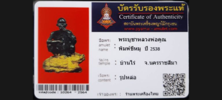บัตรที่ผ่านการรับรองไม่มีหมวดหมู่ พระบูชาหลวงพ่อคุณพิมพ์ขี่หมู วัดบ้านไร่ จ.นครราชสีมา เจ้าของพระ ร้านพระเครื่องไทย รหัสบัตร 10264 – 2564